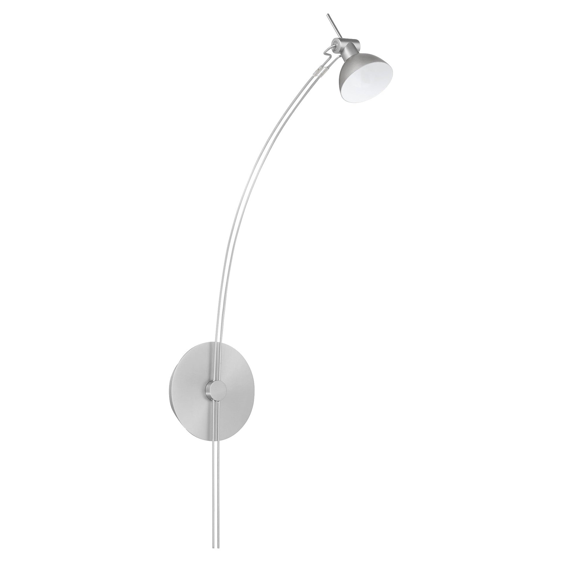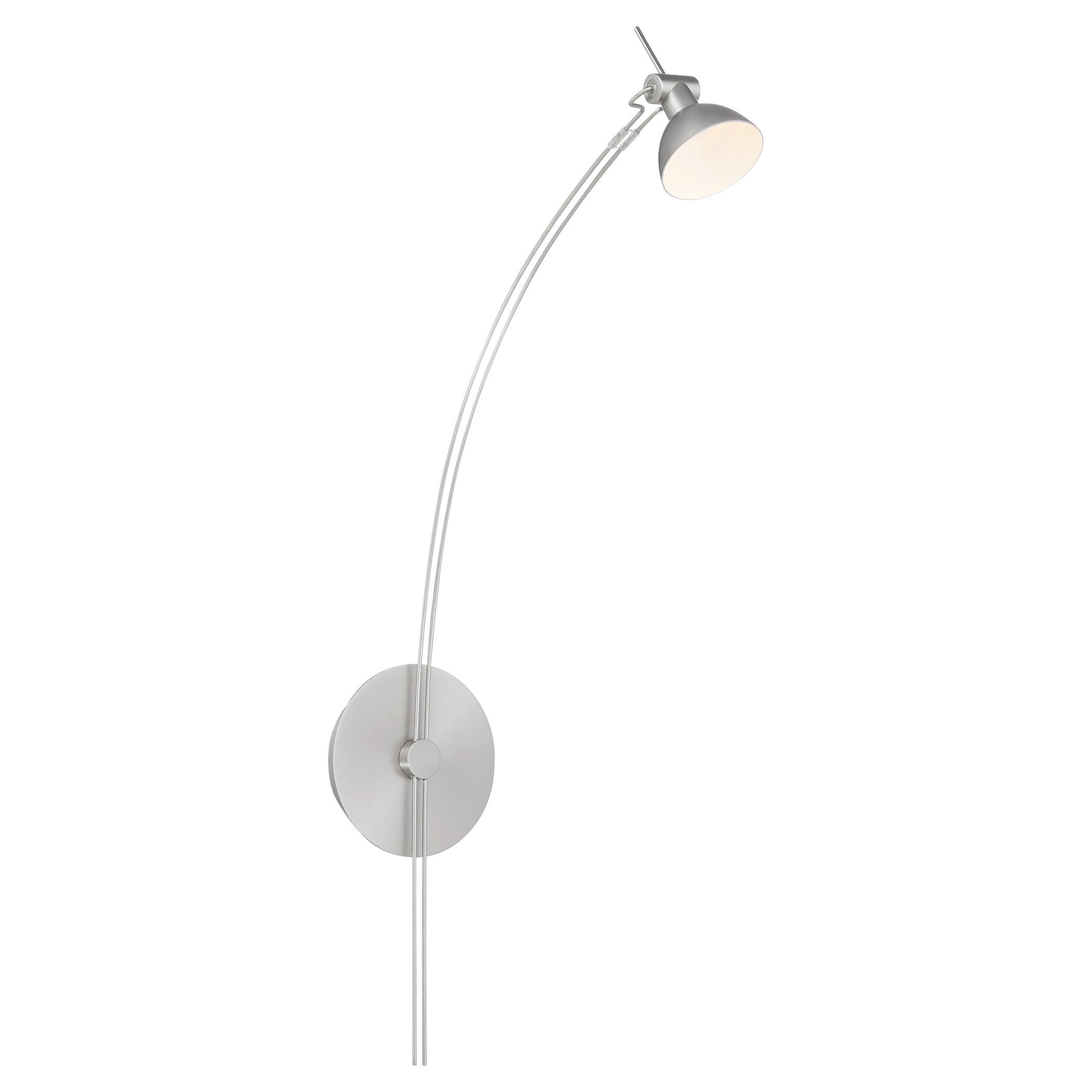 Quorum RICARDO 943-65 Modern LED Picture Light 90CRI 3000K - Satin Nickel finish. The Quorum Ricardo picture light offers a fresh take on mid-century modern industrial design. Its double-wire neck draws the eye upward, highlighting the sleek, minimalist pommel. With a museum-quality feel, the Ricardo complements a range of settings, from modern to transitional, adding a sophisticated accent to any space. Finished with aged brass, matte black, or satin nickel, this series enhances your artwork or gallery wall with quality illumination and variety. Quorum RICARDO 943-65